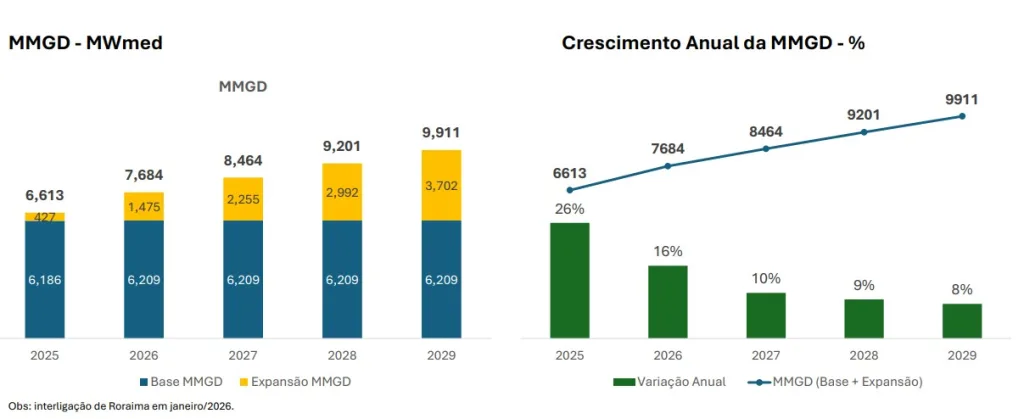 Em 2029, a MMGD total (base + expansão) atinge 9,9 GWmed, com crescimento médio anual de 12,8%.