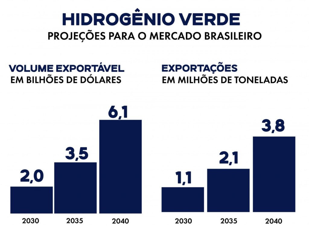As projeções da companhia mostram que o país tem condições de produzir e exportar cerca de 3,8 milhões de toneladas de hidrogênio verde até o final de 2040, garantindo assim mais de R$ 6 bilhões com venda da tecnologia, conforme ilustra a imagem abaixo.