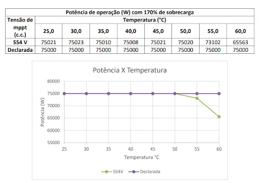 A tensão CC utilizada durante os ensaios foi de 487,5Vcc e um overload de 100% (200% de sobrecarga CC). No teste é possível observar que a potência medida (linha azul na Figura 1) está sempre acima da linha de referência (Linha vermelha da Figura 1) para todas as temperaturas testadas.