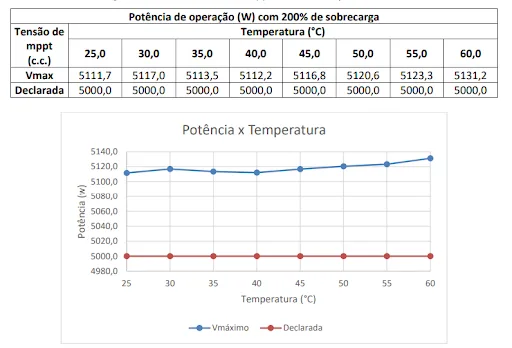 Pode-se observar também um desempenho acima do esperado, uma vez que a potência de saída do inversor supera o dado de datasheet em todas as medições realizadas demonstrando a boa construção e robustez do equipamento frente a variação de temperatura e o overload aplicado. Isso reafirma a capacidade de operação, mesmo em ambientes mais severos em utilização real do inversor.
