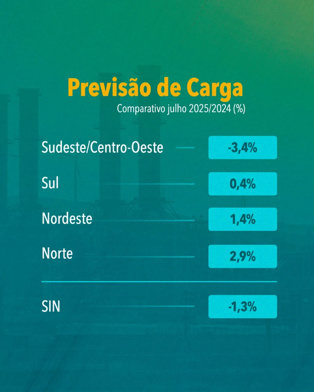 As estimativas apontam para uma redução de 1,3% na carga total do SIN (74.805 MWmed) em comparação com o mesmo período de 2024. A maior retração deve ocorrer no subsistema Sudeste/Centro-Oeste, que responde por cerca de 70% da energia gerada no país, com previsão de queda de 3,4% (40.807 MWmed).
