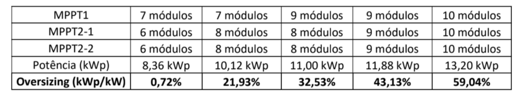 Ainda, como o objetivo do artigo é apresentar as diferenças com diversos carregamentos, não foram consideradas perdas por sombreamento nessas simulações. A localidade escolhida para a simulação foi Salvador/BA. Os resultados poderiam ser diferentes em outras localidades.