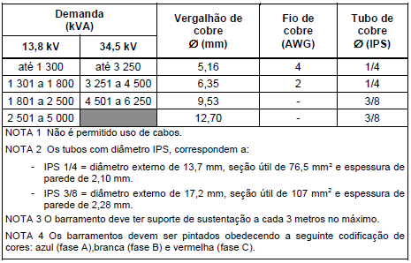 Os barramentos podem ser dimensionados em função da demanda solicitada pela instalação. No caso de uma usina fotovoltaica, pela sua geração máxima. No entanto, as concessionárias especificam estes barramentos de acordo com suas normas, como visto na Tabela 5, extraída da norma ND.20 da Elektro.