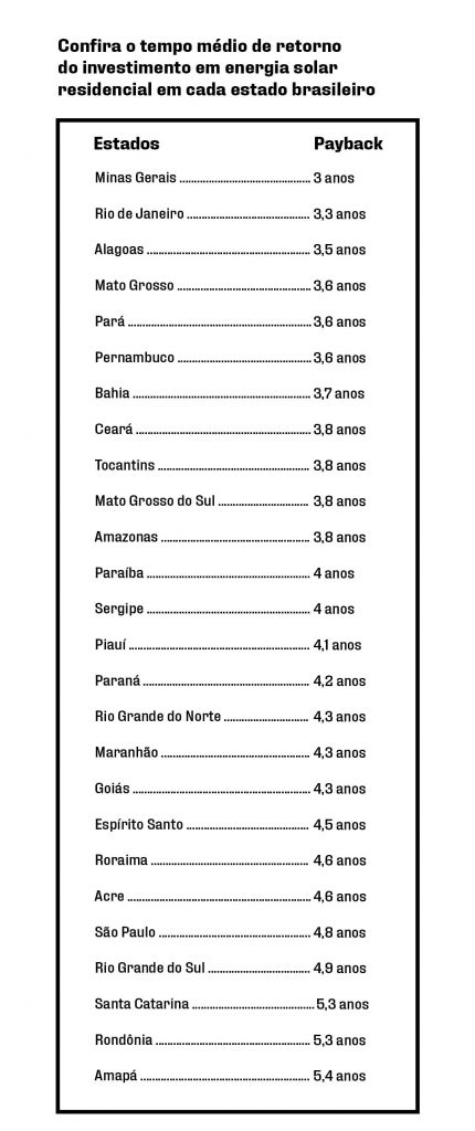 Em relação à última pesquisa, a entidade avaliou que o tempo médio de retorno do investimento de um sistema fotovoltaico de porte residencial diminuiu, em média, 5,9%, sendo que os estados da Bahia, Rio Grande do Norte e Minas Gerais foram os que mais sofreram redução, enquanto Maranhão teve um leve aumento percentual.