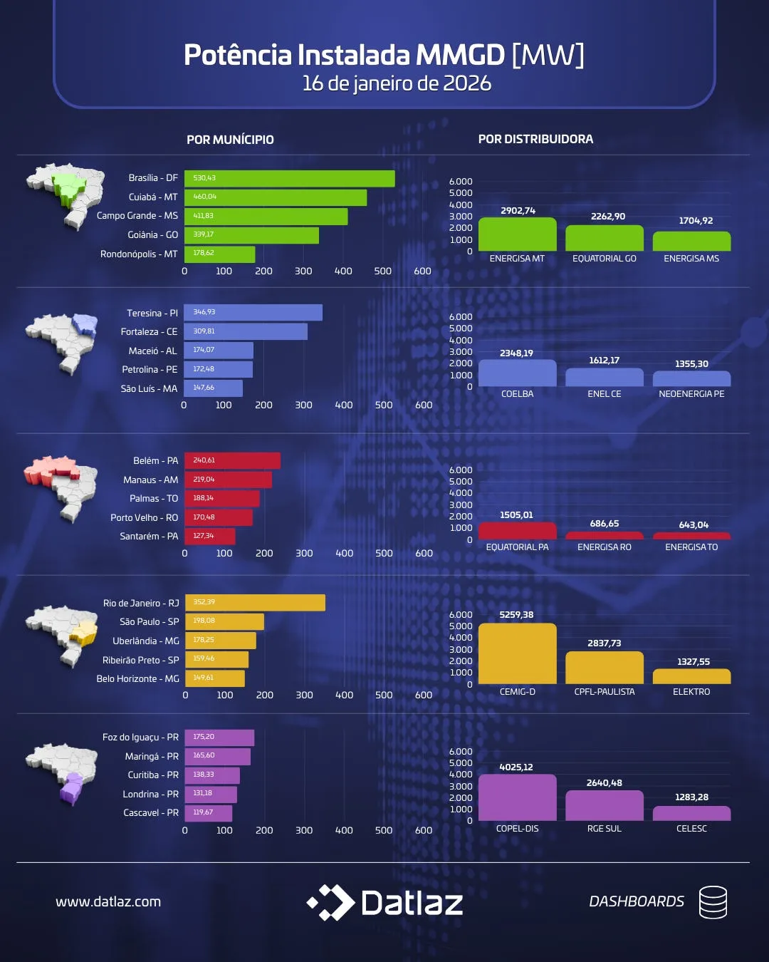 De acordo com a Datlaz, o mapeamento da potência instalada por região é essencial para avaliar níveis de saturação das redes, identificar gargalos operacionais e mapear oportunidades de expansão. A evolução da capacidade por distribuidora é considerada um dos principais indicadores para decisões estratégicas de investimento ao longo de 2026.