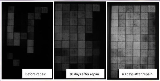 As figuras abaixo mostram resultados da atuação do sistema anti-PID descrito acima. A primeira figura ilustra um módulo fotovoltaico danificado.