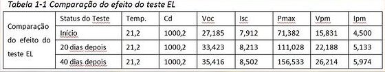 A tabela a seguir ilustra as características elétricas do módulo fotovoltaico usado no experimento da figura anterior nestas três condições: antes da reparação, após 20 dias e após 40 dias (módulo completamente regenerado).