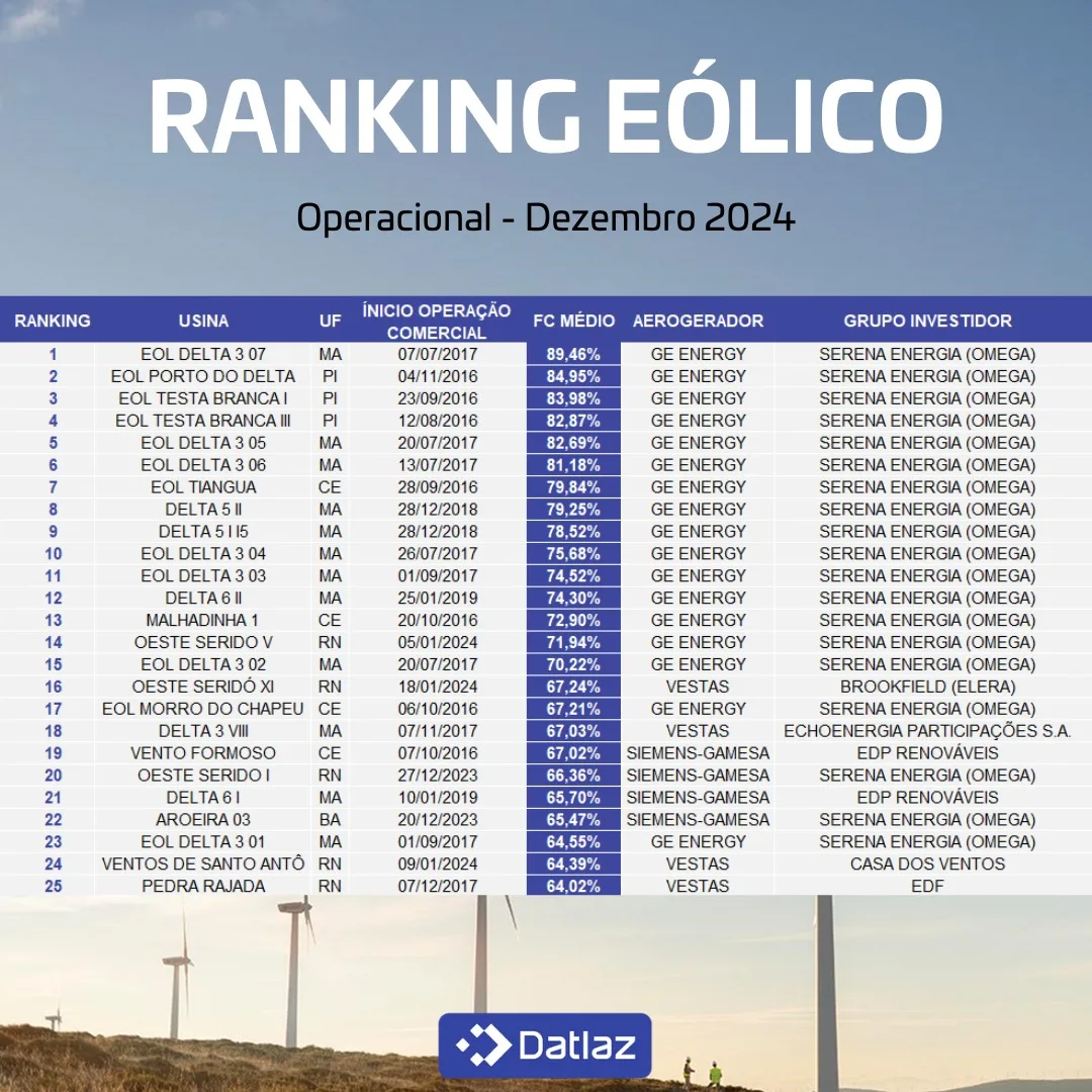A Datlaz, empresa de inteligência de dados, divulgou nesta segunda-feira (3) um levantamento com as usinas de energia solar e eólica que registraram os maiores fatores de capacidade no mês de dezembro de 2024.