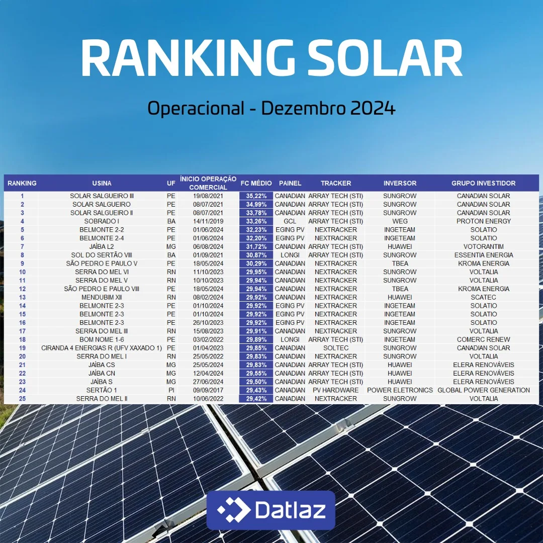 Além disso, a Datlaz ressaltou o desempenho positivo dos equipamentos da Nextracker e Array Tech, presentes em 52% e 40% das 25 usinas mais bem ranqueadas, respectivamente.