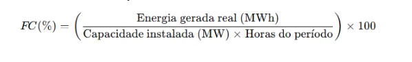 O indicador é expresso em porcentagem (%) e compara a energia real gerada em um período específico (geralmente um mês ou ano) com a energia que a usina poderia gerar se operasse na sua capacidade máxima 100% do tempo, sendo calculado da seguinte forma: