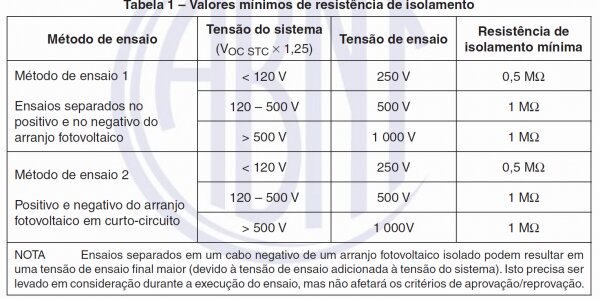 A seguir encontra-se a Tabela 1 da norma ABNT NBR 16274:2014, que mostra a parametrização de testes e os valores mínimos esperados para o ensaio de resistência de isolamento em strings fotovoltaicas.