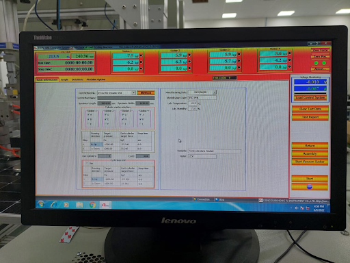 As configurações de pressão e tempo de aplicação podem ser definidas pelo usuário. A precisão da pressão aplicada é de 5%. O equipamento tem 12 cilindros, distribuídos em 4 grupos, que movimentam ventosas pneumáticas que se prendem à superfície do módulo fotovoltaico.