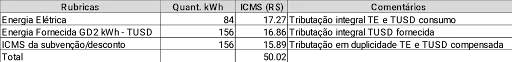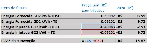 Com dificuldade, chegamos a essa memória de cálculo, que permite concluir que o ICMS Subvenção incide sobre a parcela da tarifa compensada devido a injeção de energia, mas que o consumidor não contribui diretamente, sendo custeada pela CDE.