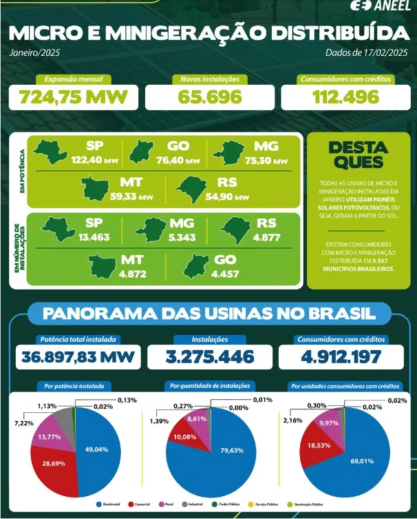 Em 17 de fevereiro, o país já contava com 3,28 milhões de sistemas conectados à rede de distribuição, totalizando 36,90 GW de potência instalada. No total, 4,91 milhões de unidades consumidoras se beneficiam da geração distribuída.